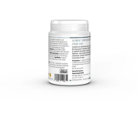 Ce probiotique pour chats et chatons soutient une alimentation saine et une bonne fonction gastro-intestinale. Il contribue Ă renforcer le système immunitaire, aide Ă rĂ©guler la digestion. Cette poudre prĂ© et probiotique est bien tolĂ©rĂ©e et savoureuse. Elle convient Ă toutes les races de chats et pour tous les âges. Conseils d’utilisation : À utiliser en cas de problèmes digestifs, lors des changements d’alimentation (surtout chez les chatons), en cas de changement de consistance des selles, ou en cas de problèmes de mĂ©tabolisme, comme un pelage terne. Peut aussi se consommer avant la prise de mĂ©dicaments, en cas de flatulences, de manque d’appĂ©tit, de situations de stress, d’efforts physiques, de voyages, d’entraĂ®nements ou de randonnĂ©es. Composition : Levure de bière, Inuline (ChicorĂ©e), FOS (Fructo-oligosaccharides), Foie de volaille hydrolysĂ©, MOS (Mannan Fructo-oligosaccharides), MinĂ©raux. Additif zootechnique : Stabilisateur de la flore intestinale : Enterococcus faecium DSM 10663/NCIMB 10415 1×1011 UFC/kg, Lactobacillus acidophilus CECT 4529 1×1010 UFC/kg. IngrĂ©dients : ProtĂ©ines brutes : 22,0%, Matières grasses brutes : 4,1%, cellulose brute : 0,5%, Cendres brutes : 8,1%, HumiditĂ© 6,8%. Conseils d’alimentation journalier : Pour les chats : 1 mesure par 5 kg de poids corporel. Maximum 4 cuillères. Cuillère doseuse (environ 0,75g) incluse. Saupoudrer la poudre sur la nourriture. Un rĂ©sultat optimal est obtenu par une utilisation rĂ©gulière et durable. PrĂ©cautions d’emploi : A conserver Ă l’abri de la lumière et de la chaleur, dans un endroit sec. Produit non destinĂ© Ă la consommation humaine. Tenir hors de portĂ©e des enfants. DLC voir sous le produit. Animaux : chat et chaton Contenance : 40 g Substance : poudre FabriquĂ© en Allemagne.