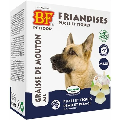 Bonbons BIOFOOD pour faciliter la digestion de votre chien.Aux extraits d’ail et Ă base de graisse de mouton.Paquet de 40 bonbons. Comment entretenir le transit de votre animal tout en lui faisant plaisir ? Les bonbons BIOFOOD puces et tiques facilitent la digestion et aident Ă Ă©liminer les toxines. Ces bonbons Ă base de graisse de mouton et aux extraits d’ail agissent afin d’accĂ©lĂ©rer la digestion et de la rendre plus facile. Ils favorisent Ă©galement l’assainissement et la purification de l’Ă©piderme, tout en tonifiant et enrendant la peau de votre animal plus rĂ©sistante. Ces bonbons rendront le pelage de votre animal soyeux, tout en lui donnant de l’Ă©nergie. Ils serviront Ă©galement de protection naturelle contre les parasites. COMPOSITION ET CARACTERISTIQUES : Graisse de mouton (95 %), ail (5 %), Matières grasses brutes 95%, ProtĂ©ines brutes 1%, Cendres brutes 0,5%, Fibres brutes 1%, HumiditĂ© 0,6%, Glucides 1,9%, Vitamine A IE 2000, Vitamine D3 IE <300. Par 1000g, AccĂ©lère la digestion pour la rendre plus facile, Stimule l’Ă©limination des toxines, Assainit et purifie l’Ă©piderme, Une peau plus rĂ©sistante , tonifiĂ©e et un pelage soyeux , Apporte Ă©nergie et vitalitĂ©, Protection naturelle contre les parasites, Pour toutes les races de chiens et tous les âges.