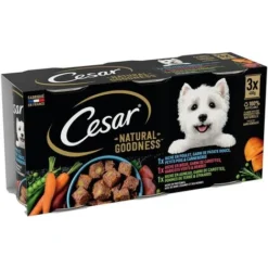 Aliment complet pour chiens adultes – 3 variétés en terrine sans céréales (Riche en poulet, garni de patate douce, petits pois & canneberge / Riche en boeuf, garni de carottes, haricots verts & herbes / Riche en agneau, garni de carottes, pommes de terre & épinards). Les délicieuses boîtes pour chiens Cesar NATURAL GOODNESS sont nutritionnellement complètes et élaborées avec des ingrédients 100% naturels*.