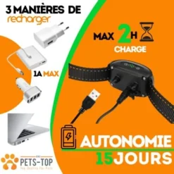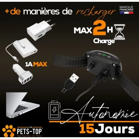 MAXI AUTONOMIE, JUSQU’Ă€ 15 JOURS D’UTILISATION. Le collier est Ă©quipĂ© d’une batterie rechargeable de 480 mAh, vous offrant 10 Ă 15 jours d’utilisation sur une seule charge. Chargeur Rapide prend 2,5 Ă 3 heures. La technologie de protection de charge donne un signal en cas de surcharge de la tension d’entrĂ©e et arrĂŞte automatiquement la charge. Ainsi fini les problèmes de compatibilitĂ© avec les chargeurs ! Notre antiaboiement fonctionne sans pile.