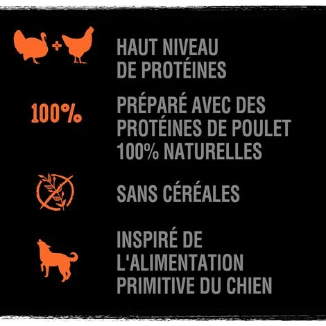 Composition détaillée : Composition: poulet 27% (cous, poulet haché et désossé, foie, coeurs), dinde 26% (dinde hachée et désossée, foie, coeurs), porc 14% (porc haché et désossé, coeurs), substances minérales, concentré de bouillon de poulet (0.5% équivalent à 28% de bouillon de poulet), pulpe de betterave déshydratée.