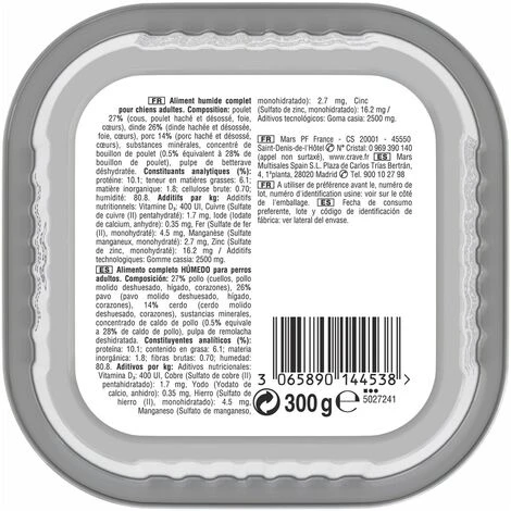 Aliment complet humide pour chiens adultes (1 an et plus) – Barquette au Poulet et Ă la Dinde. Les terrines pour chiens CRAVE sont composĂ©es avec 65% d’ingrĂ©dients d’origine animale pour participer au maintien de la masse musculaire. InspirĂ©es de l’alimentation primitive du chien, les recettes CRAVE sont prĂ©parĂ©es avec des protĂ©ines animales de haute qualitĂ© pour un goĂ»t que les chiens adorent.
