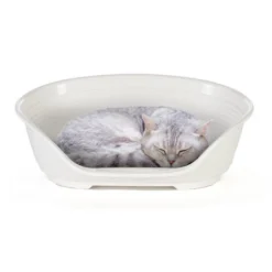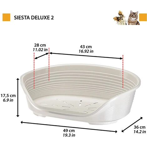 Siesta Deluxe est un panier pour chiens et chats pratique et polyvalente. Fabriqué en plastique solide et robuste, il a une forme arrondie agréable pour accueillir vos animaux. Conçu pour être extrêmement confortable, avec des bords hauts et une face avant abaissée pour faciliter l’accès, il dispose d’un appui-tête util et d’un fond perforé spécial qui assure le passage correct de l’air. Les pieds en plastique avec patins en caoutchouc antidérapants maintiennent le panier très stable.