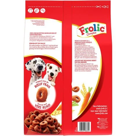 Aliment complet pour chiens adultes. Les croquettes Frolic sont simplement dĂ©licieuses et complètes d’un point de vue nutritionnel. Un bol de Frolic Complet, prĂ©parĂ© avec du boeuf frais savoureux, des carottes, des cĂ©rĂ©ales, des vitamines et des minĂ©raux, apportera chaque jour Ă votre chien joie de vivre et vitalitĂ©. De plus, les croquettes Frolic ne contiennent pas d’exhausteur de gĂ´ut : elles sont simplement dĂ©licieuses!