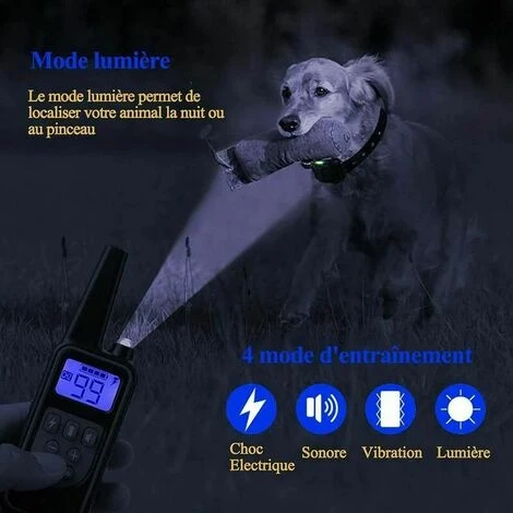Etapes recommandées de dressage : Quand un chien a un mauvais comportement : 1.Utilisez le mode Beep pour avertir le chien avec le son ; 2.Si le chien ne réagit pas, utilisez le mode Vibration ; 3.Le mode Vibration peut avoir un bon effet de dressage pour certains chiens et arrêter leurs mauvais comportements. Si le chien ne réagit pas aux vibrations, utilisez de façon courte le mode choc électrique (l’intensité est réglable, ce qui est complètement sûr pour le chien). Après avoir reçu les différents avertissements du dressage, le chien peut arrêter son mauvais comportement chaque fois qu’il entend l’avertissement sonore. En général, vous n’aurez plus besoin de passer aux modes de vibration ou de choc électrique. Récepteur 100% étanche. Il fonctionne même s’il est immergé dans l’eau, ce qui permet à votre chien de nager ou de se baigner librement avec le collier. 800 mètres de portée Le collier de dressage à distance utilise la fréquence RF434Mhz pour offrir une portée allant jusqu’à 800 mètres, Dressez facilement votre chien dans le parc ou la cour. Convient à tous les chiens. Collier en TPU durable et réglable (16 à 62) capable de s’adapter à de petits et moyens chiens. Télécommande et récepteur rechargeables La télécommande et le récepteur du collier disposent d’une grande autonomie (1 à 2 heures de temps de charge vous donnent 7 à 14 jours d’utilisation) avec des batteries lithium-ion. De plus, le mode d’économie d’énergie automatique permet de préserver l’autonomie de la batterie lorsque vous ne les utilisez pas.