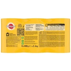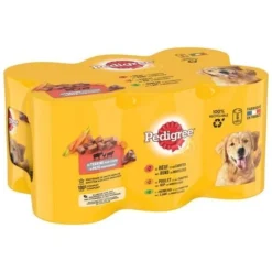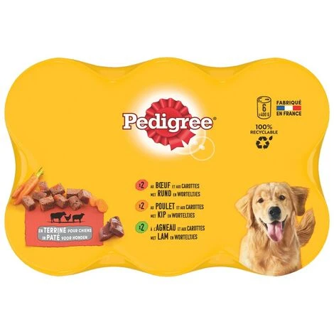 Aliment complet pour chiens adultes en terrine – 3 variétés (au boeuf et aux carottes / au poulet et aux carottes / à l’agneau et aux carottes). Délicieuses recettes en terrine avec des ingrédients naturels* pour le plus grand plaisir de votre chien. Parfaites pour offrir un savoureux repas préparé à votre chien, les boîtes Pedigree contribuent à lui apporter une nutrition de qualité pour répondre à tous ses besoins. Élaborée par nos vétérinaires, la pâtée pour chien Pedigree garantit une alimentation équilibrée, avec des vitamines et des minéraux.