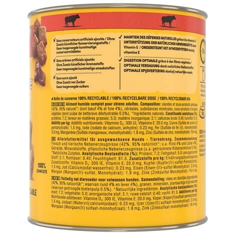 Composition détaillée : au boeuf: viandes et sous-produits animaux (42%, 95% naturel*; dont b?uf 4% et foie 4%), céréales, substances minérales, sous-produits d’origine végétale (dont pulpe de betterave déshydratée 0.5%). *Ingrédients naturels.