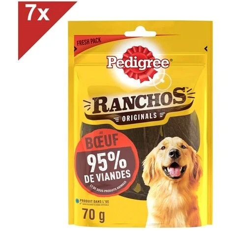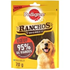 Aliment complĂ©mentaire pour chiens adultes. Savoureuses et tendres friandises Ă mâcher riche en boeuf – 95% de viandes et de sous-produits animaux. Pedigree Ranchos, pour satisfaire les instincts naturels de votre chien et le rendre fou de joie. DĂ©licieuses rĂ©compenses dĂ©licatement sĂ©chĂ©es pour avoir cette odeur et ce goĂ»t irrĂ©sistibles que les chiens adorent. Produites dans l’Union EuropĂ©en, ces friandises sont sans colorant ni arĂ´me artificiels. Pedigree Ranchos Originals est une excellente façon de rĂ©compenser votre chien ou simplement de lui montrer combien vous l’aimez. En format sachet refermable pratique d’utilisation lors de vos sorties avec vote chien.