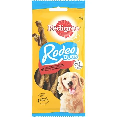 Aliment complĂ©mentaire pour chiens adultes. IrrĂ©sistibles torsades Ă mâcher saveurs Boeuf & Fromage. La friandise pour chien Pedigree Rodeo Duos est une excellente façon de rĂ©compenser votre chien ou simplement de lui montrer combien vous l’aimez. DĂ©licieuse friandise sans arĂ´mes artificiels, Ă moins de 5% de matières grasses / 100g. Avec des omega 3 pour l’aider Ă rester en forme tout au long de sa vie, des vitamines pour l’aider Ă prĂ©server ses dĂ©fenses naturelles et des minĂ©raux, dont du calcium, pour l’aider Ă garder des os solides.