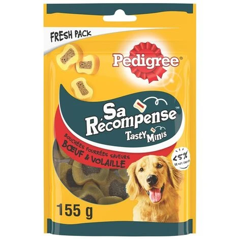 Aliment complĂ©mentaire pour chiens adultes. PEDIGREE® Sa RĂ©compense BouchĂ©es FourrĂ©es saveurs boeuf et volaille, ce sont de savoureuses bouchĂ©es, avec une dĂ©licieuse texture pour mastiquer, parfaites pour faire plaisir Ă votre chien Ă tout moment de la journĂ©e ou le rĂ©compenser pendant les sĂ©ances d’Ă©ducation ! Avec des omega 3 pour l’aider Ă rester en forme tout au long de sa vie, des vitamines E pour l’aider Ă prĂ©server ses dĂ©fenses naturelles et des minĂ©raux, dont du calcium, pour l’aider Ă garder des os solides. Friandise sans colorant ni arĂ´me artificiels, Ă moins de 5% de matières grasses / 100g.